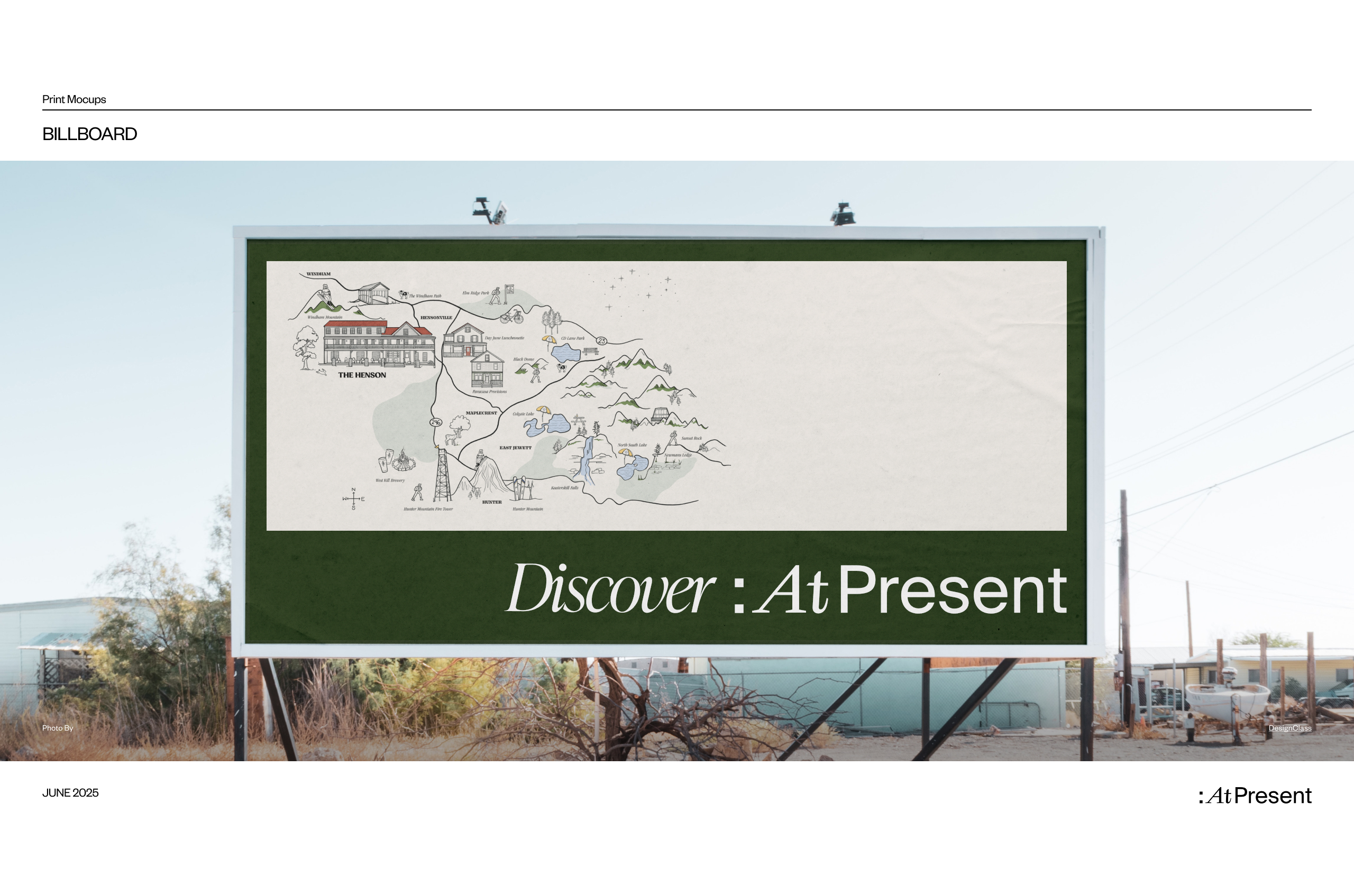 To expand the brand experience beyond the retreat, I designed mockups for potential brand extensions: a branded T-shirt that captured the minimalist yet thoughtful tone of At Present, and a billboard concept (first image used) that translated the retreat’s identity into a large-scale visual statement. These pieces demonstrated how the event’s visual direction could scale seamlessly from intimate, tactile moments to broader marketing applications — bridging experience design with brand communication.
