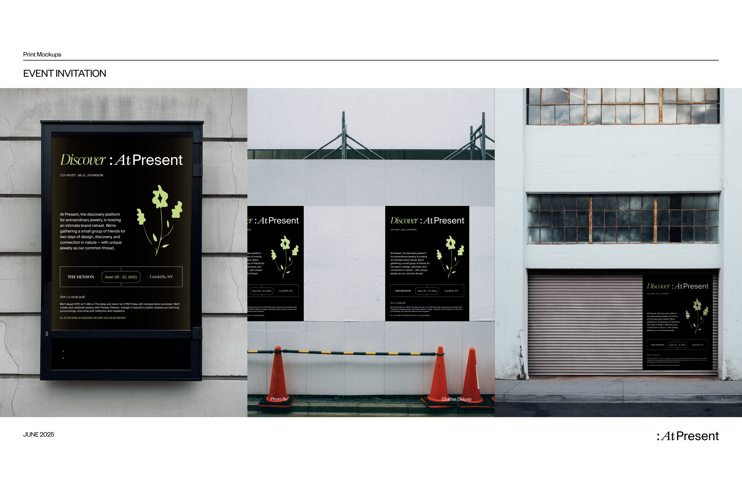 Hosted at The Henson in New York, this 24-hour jewelry brand influencer retreat was designed to immerse attendees in At Present’s ethos of discovery, presence, and intentional living. My role was to translate this philosophy into a cohesive visual identity and set of branded touch-points, ensuring the experience felt curated, elevated, and memorable from invite to takeaway.