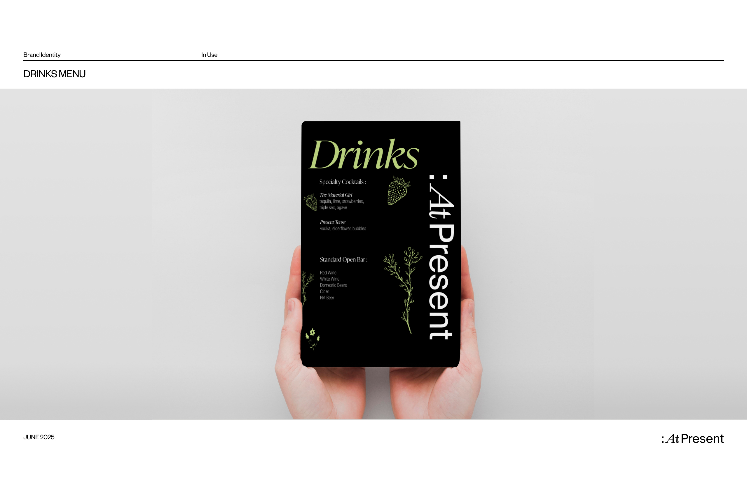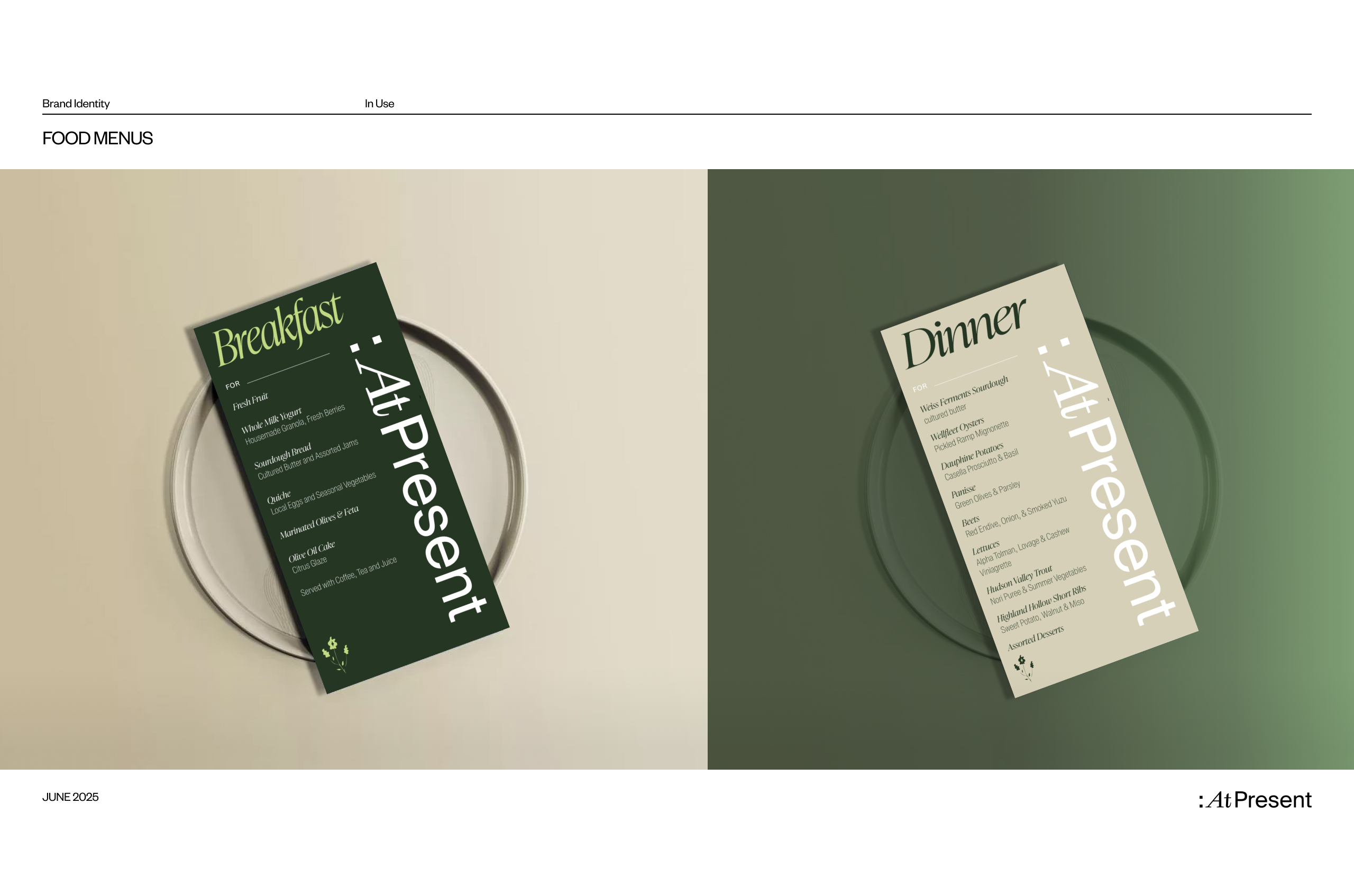 The typography and layout were designed to feel like an extension of the Field Guide — restrained, tactile, and elevated — with proportions and paper choice reinforcing the idea of thoughtful curation. Together, the menus formed a series of collectible keepsakes that embodied At Present’s dedication to materiality and craft.