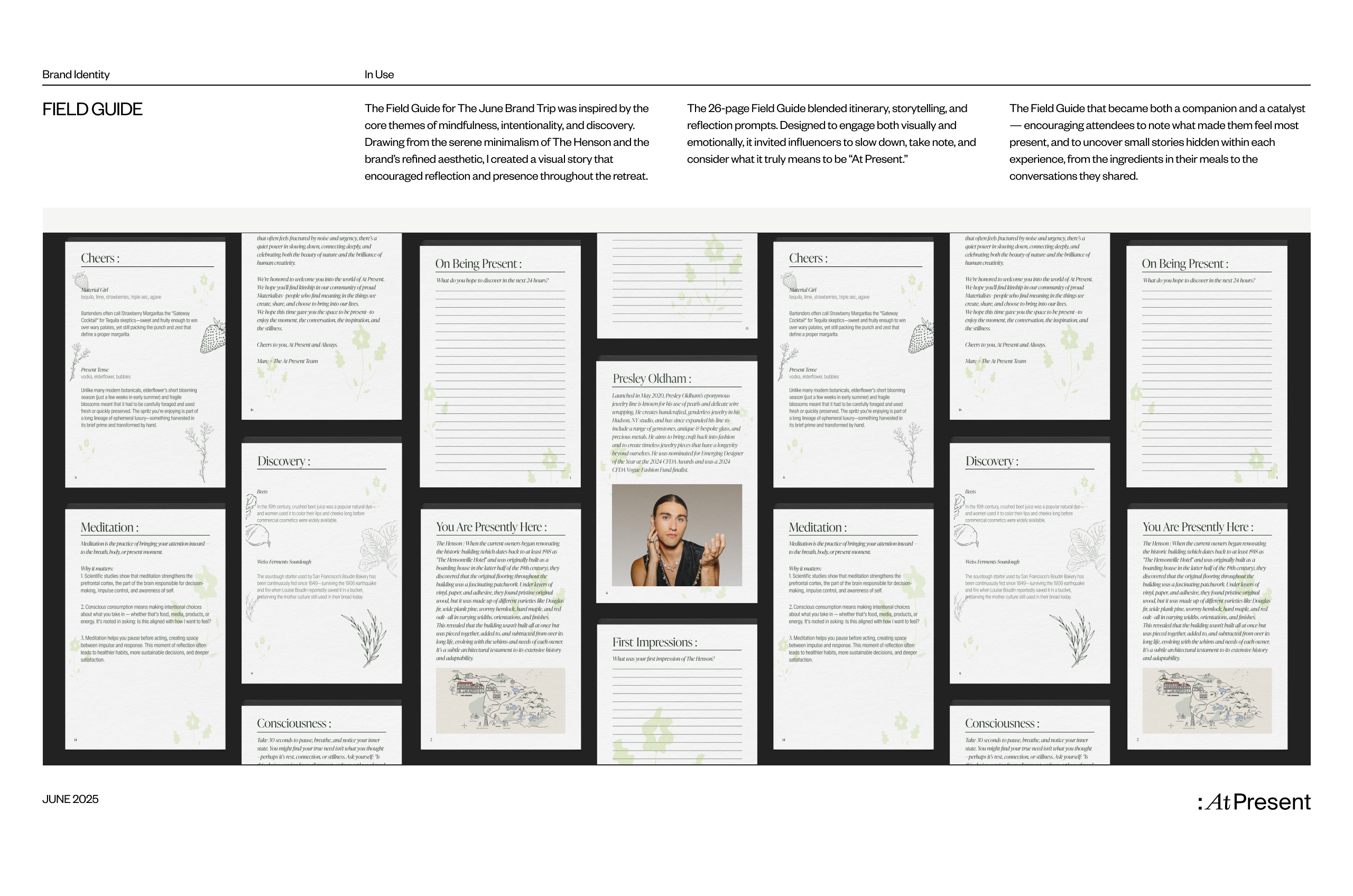 The centerpiece of the event collateral, the Field Guide, was designed as a hybrid between a journal, itinerary, and brand storybook. Structured to guide influencers through a 24-hour journey of reflection and discovery, each spread wove together functional content (schedule, location details) with micro-stories about ingredients, materials, and historical context.