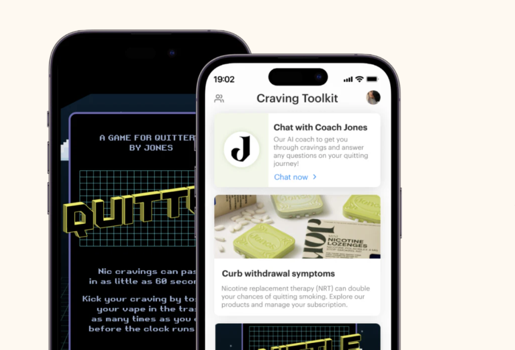 In collaboration with the Jones team and designers to translate behavioral research into a UX strategy for their app, a community has been built. By uncovering how social influence drives vaping behaviors, we designed features that foster peer support, celebrate milestones, and normalize quitting as a shared, empowering experience. My work focused on user research, behavioral analysis, and journey mapping to help the team create a community-driven, sustainable approach to quitting.