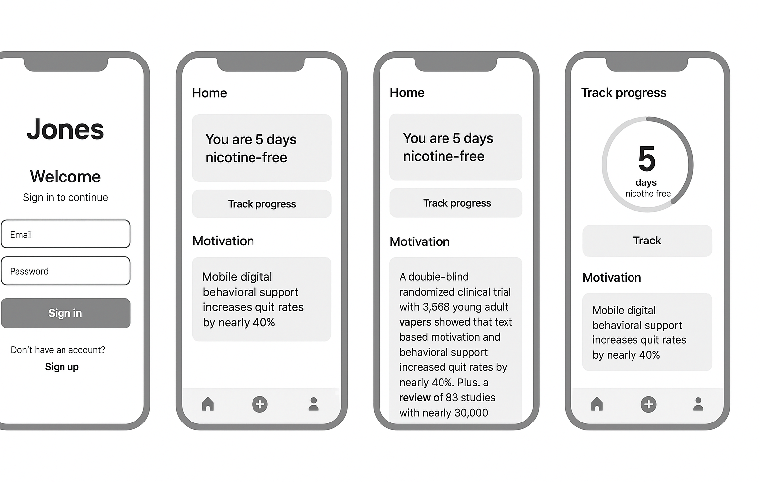 Through qualitative research and behavioral analysis, the Jones Team uncovered that vaping habits often start and persist because of community influence—friends, social settings, and shared routines. This insight reframed how we approached the product experience. Rather than fighting those social dynamics, we designed ways to redirect them toward positive behavioral reinforcement.Visually represented by: early research synthesis, persona development, and flows that map emotional touch-points across the quitting journey.